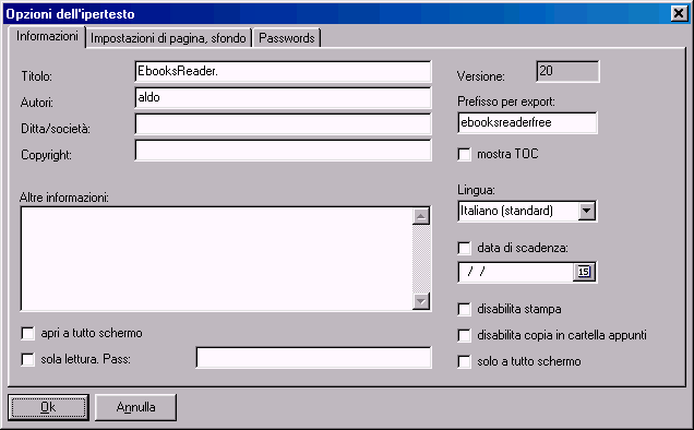 Con “Ipertesto >Proprietà dell'ipertesto corrente” si accede a questa finestra dove si possono impostare le protezioni elencate nel titolo in modo molto intuitivo.