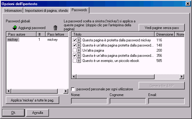 Con “Ipertesto >Password” si visualizza questa finestra, dov'è possibile applicare una password ad una pagina o a un gruppo di pagine.