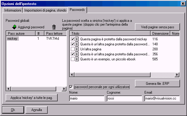 Questa immagine invece mostra come scegliere password diverse per utenti diversi. Per te (l'autore) la password rimarrà “mickey”, mentre per il lettore “mario rossi” (abbiamo scritto il suo nome ed email in basso a destra) la password sarà “TVKTMd”.